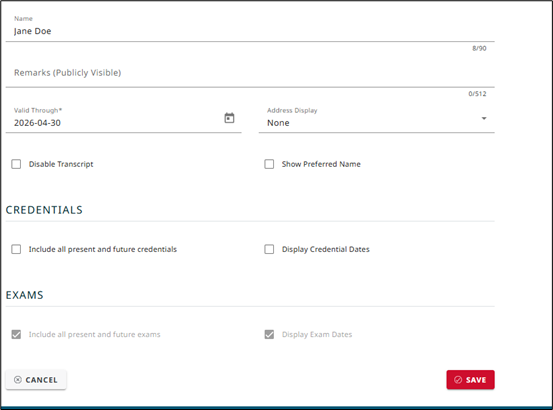 Complete the form and select the certifications to include in the transcript and save