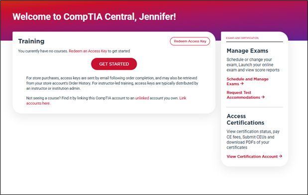 Log in to your CompTIA Central account at https://login.comptia.org. Use the password reset option if needed.