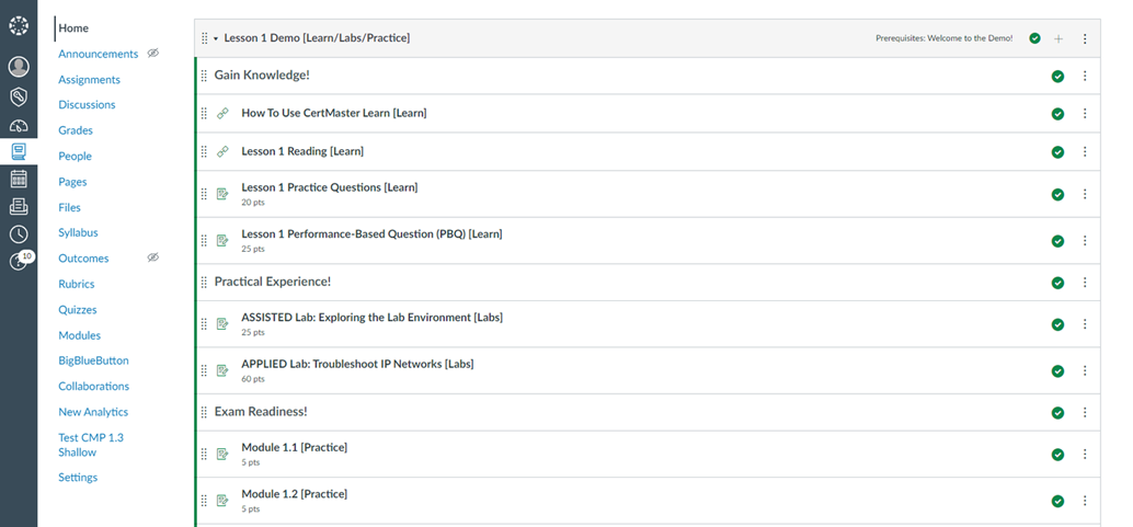 An example of how a Lesson might look in Canvas using all of our learning products. The first section is the CertMaster Learn content.