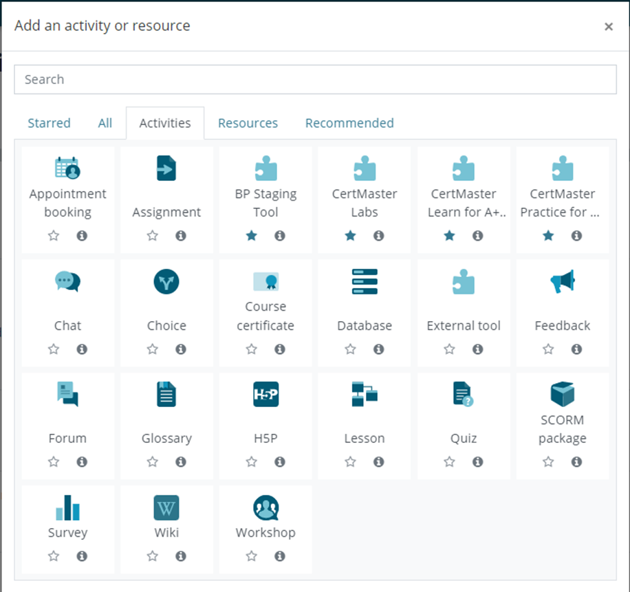 If you cannot find the tool in the Activity Chooser, your LMS Admin may have chosen to not show it there. In this case, select External tool from the Activity Chooser, and in the dialogue that appears, select the desired tool from the Preconfigured tool dropdown second from the top.