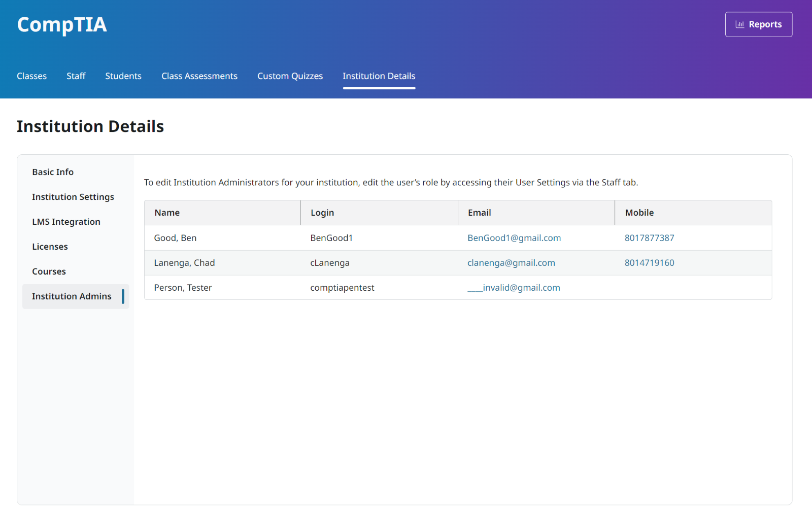 If you have platform administrator rights, under your organization name you would see a tab labeled Staff. Those who do not see this tab can still find out who is designated as an administrator. An instructor can view their students, classes, and report data. An administrator can view all students, any class, report data, as well as control the release of new product versions.