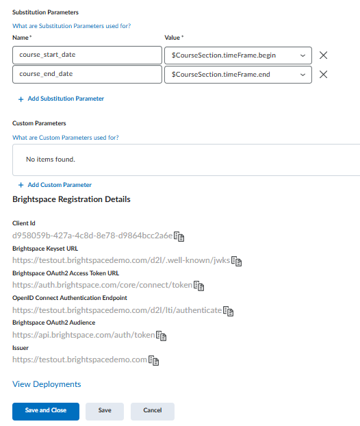 - At the bottom of the tool registration form, click View Deployments to once again view the registration details and to move on the Part 2 below.