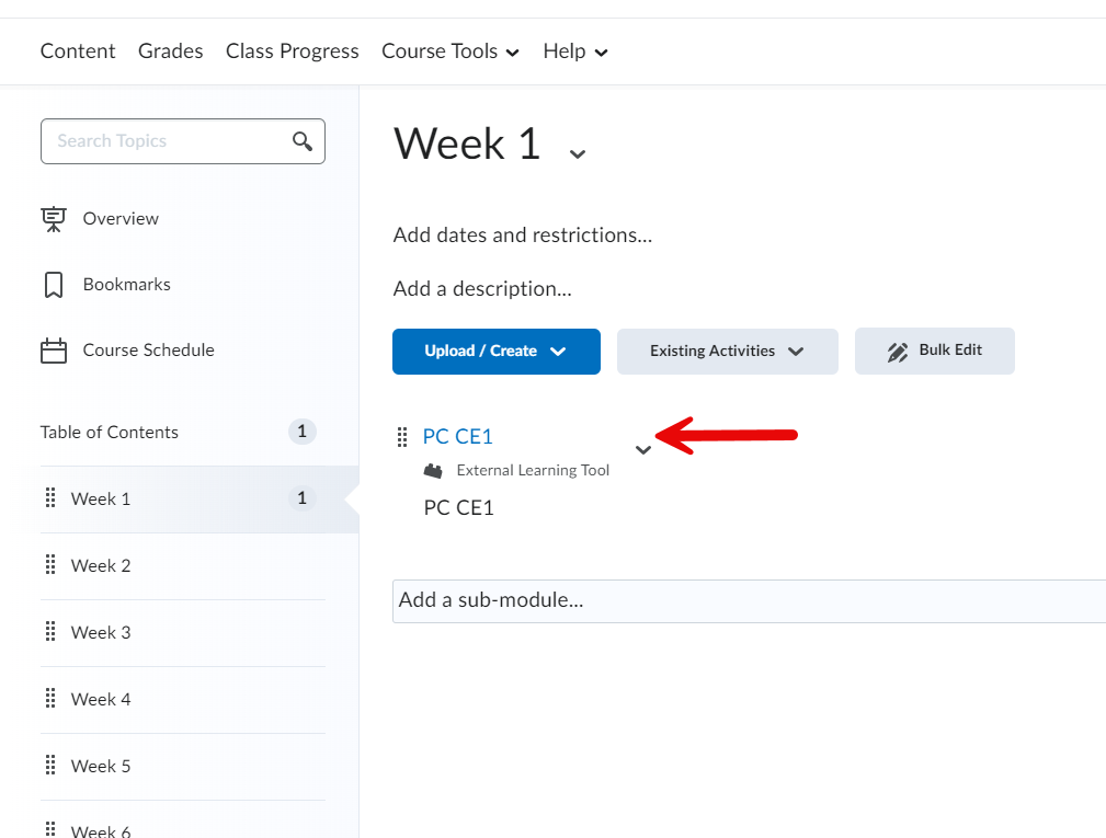 1. After creating your course with a start and date, navigate to Content > Table of Contents. Within a module of your creation select CertMaster LTI Advantage (or a variation of this name, such as CertMaster LTI 1.3) from the Existing Activities menu within your module. To create a link for a Custom Quiz, choose the Custom Quizzes button.