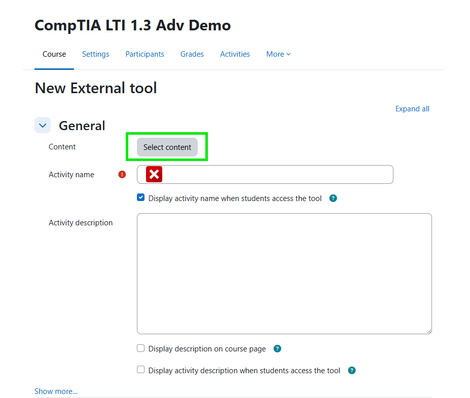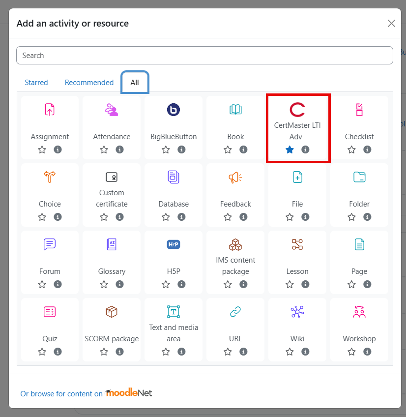 Note: In newer versions of Moodle, you may need to navigate to the Course's settings, select 'LTI External Tools' from the 'More' dropdown, and enable the CertMaster LTI Adv tool before proceeding.