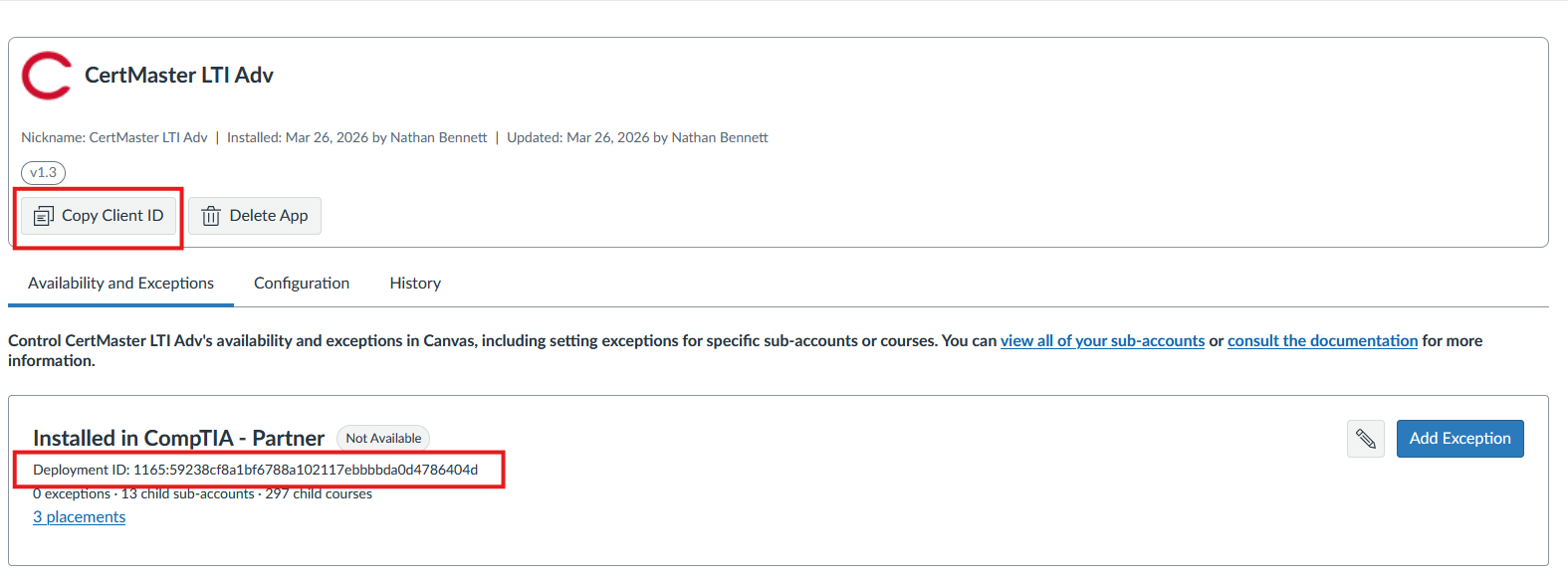 - Note the Copy Client ID button at the top, and the 'Deployment ID' field under 'Installed in <Account Name>'.